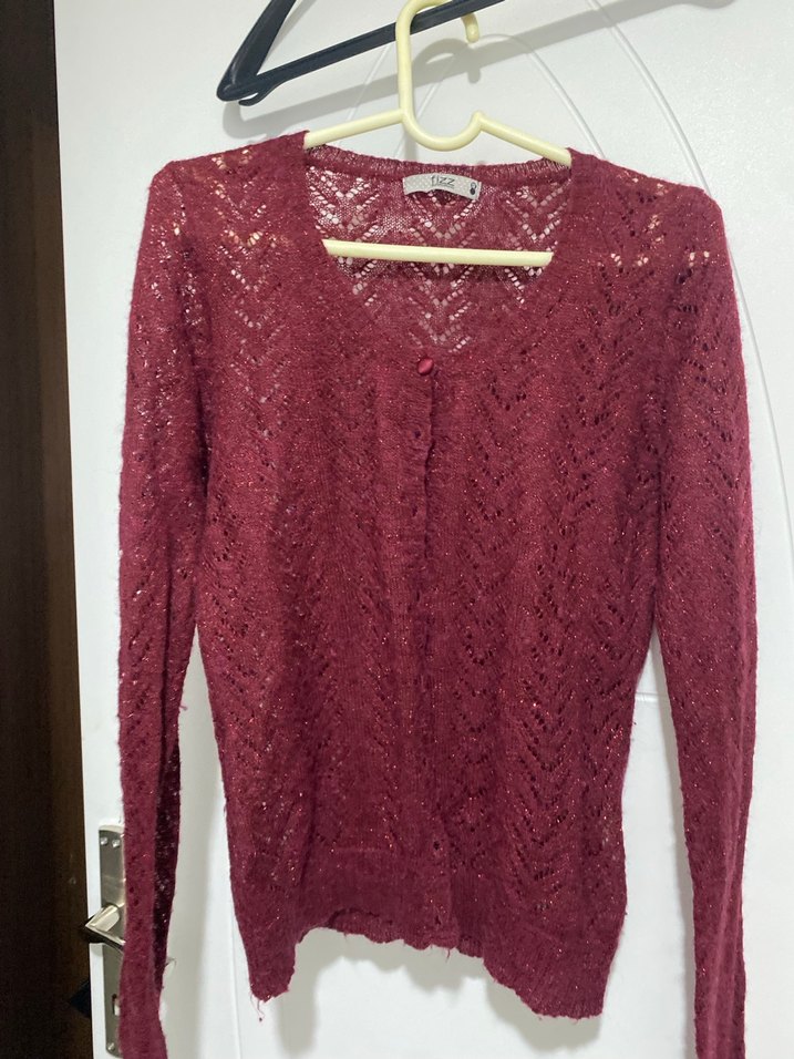 Bordo renkli, v yaka ve uzun kollu, yumuşak dokulu örgü kadın hırka. Midi boyda, bohem tarzda ve günlük rahat kullanıma uygun.