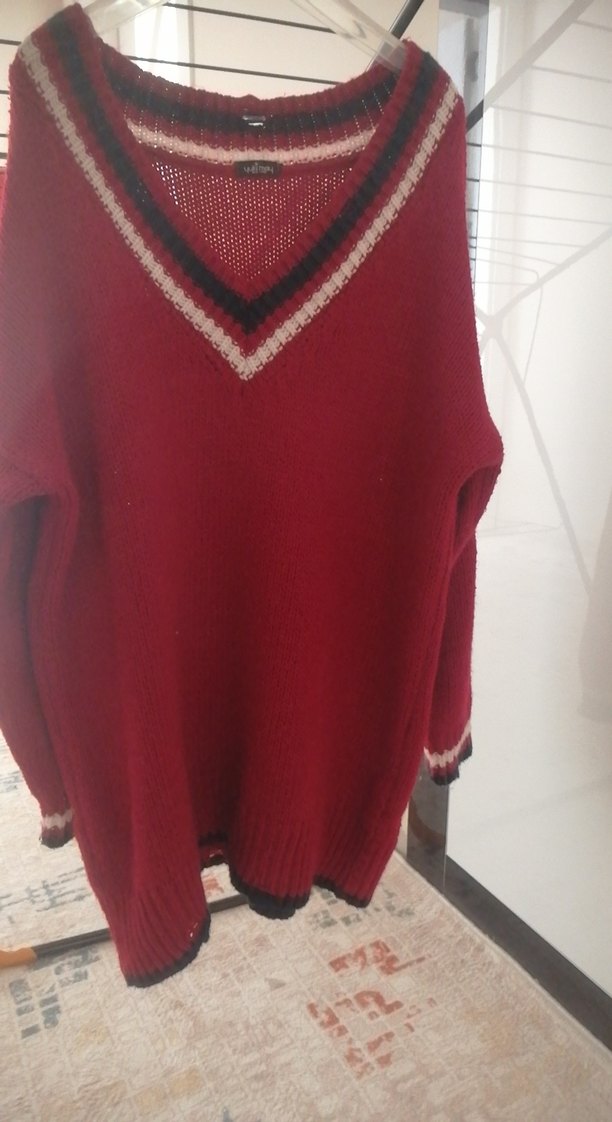 Bordo renkli, V yaka ve uzun kollu örgü kazak. Rahat kesimli, parlak görünümlü ve gündelik kullanıma uygun, desen içermeyen tasarım.