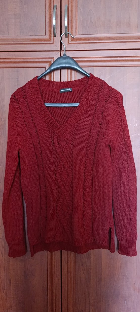 Bordo renkli, V yaka ve uzun kollu S M bedene uygun örgü kadın kazak. Rahat ve bol kesimiyle günlük kullanıma uygundur.