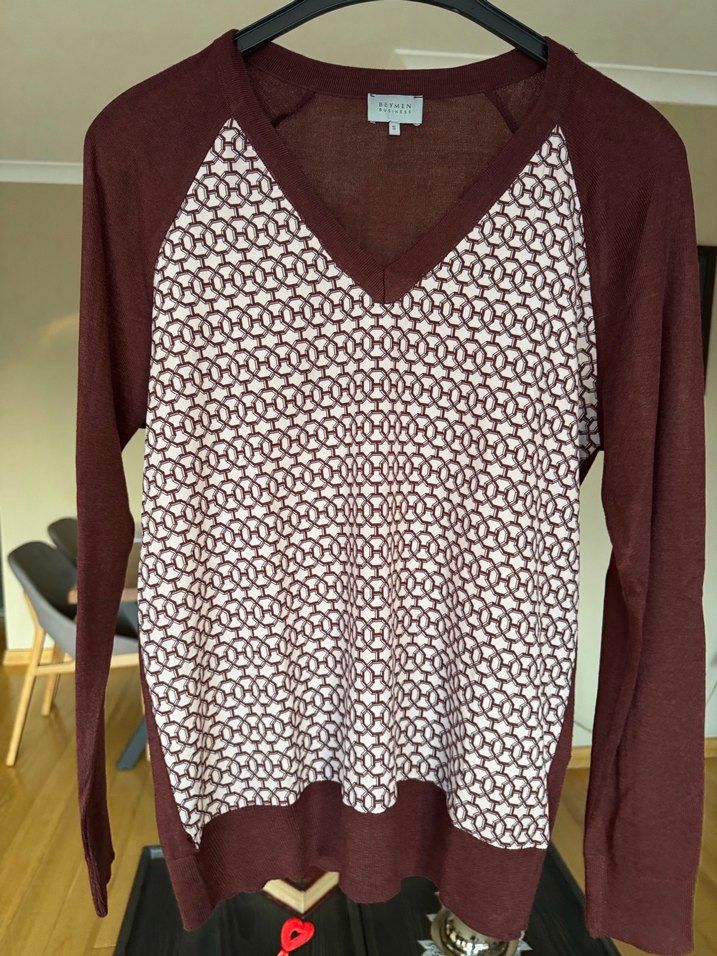 Bordo renkli, uzun kollu ve V yakalı kadın kazak. Örgü dokusu ve pamuklu kumaşı ile rahat, salaş kesim sunar. Günlük kullanıma uygundur.