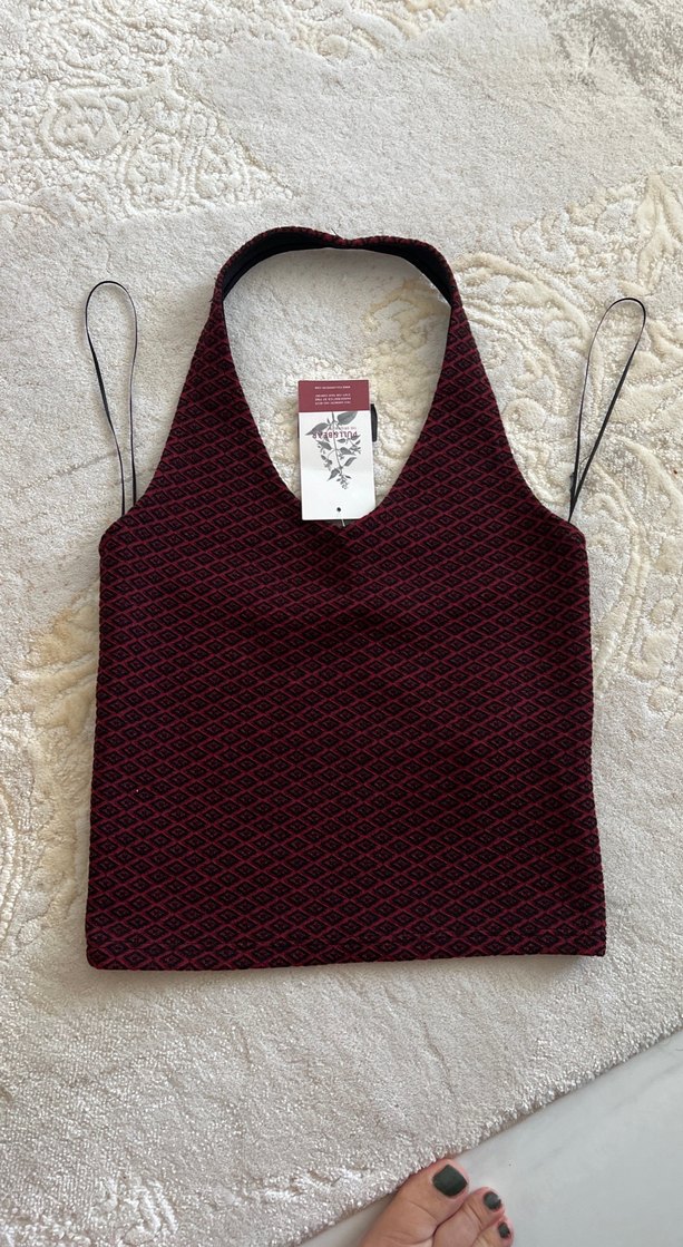 Bordo örgü, V yaka, kolsuz, baskılı desenli, midi uzunlukta ve vücuda oturan kadın süveter. Günlük sokak stili için uygun.