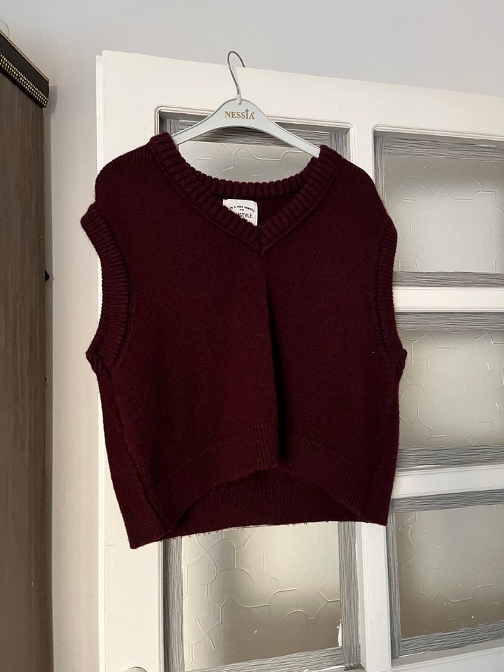 Bordo renk, örgü yün kumaştan, V yaka ve kolsuz tasarımlı, rahat kesim kadın süveter. Günlük kullanıma uygun sıcak ve şık bir parça.