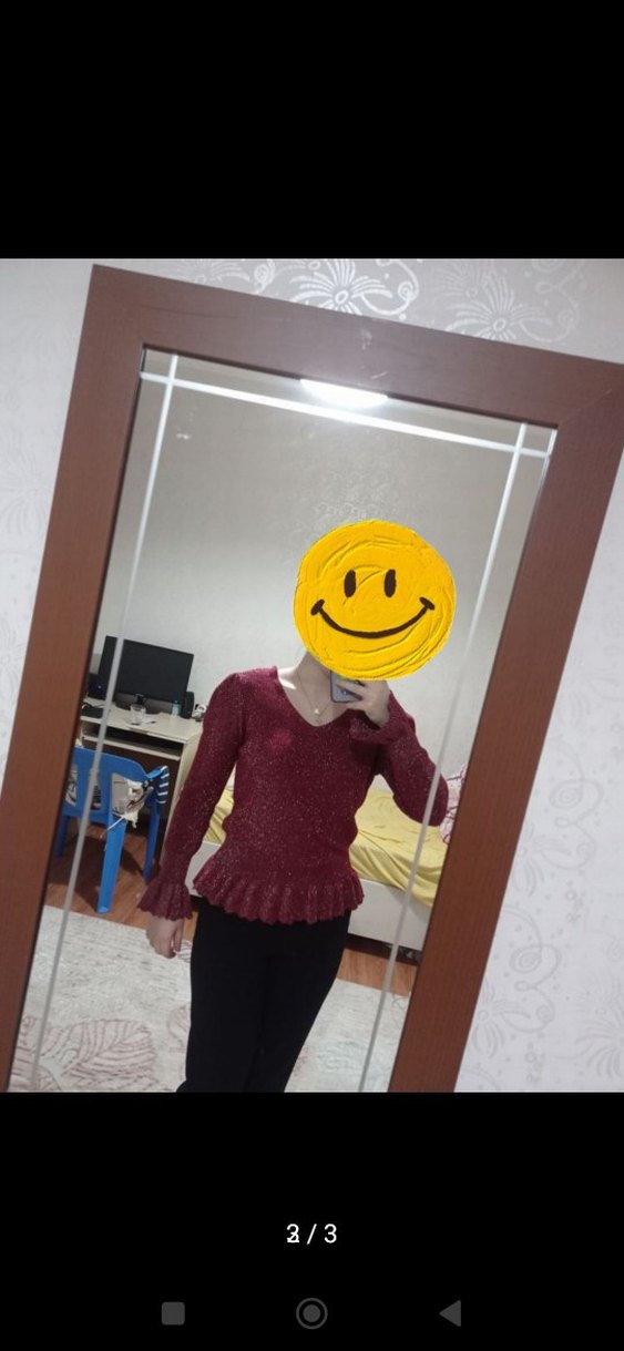 Bordo renkli, örgü dokulu, V yaka ve uzun kollu, vücuda oturan midi uzunlukta kadın kazak. Renkli batik desenlidir, gündelik kullanıma uygundur.