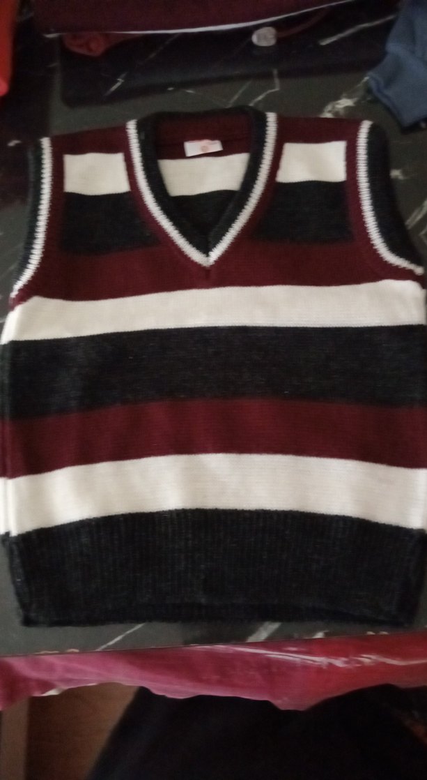 Bordo renkli, V yaka, örme kumaştan, kolsuz ve dar kesim erkek süveter. Geniş yatay çizgilerle sade tasarım, günlük sokak stili için uygundur.