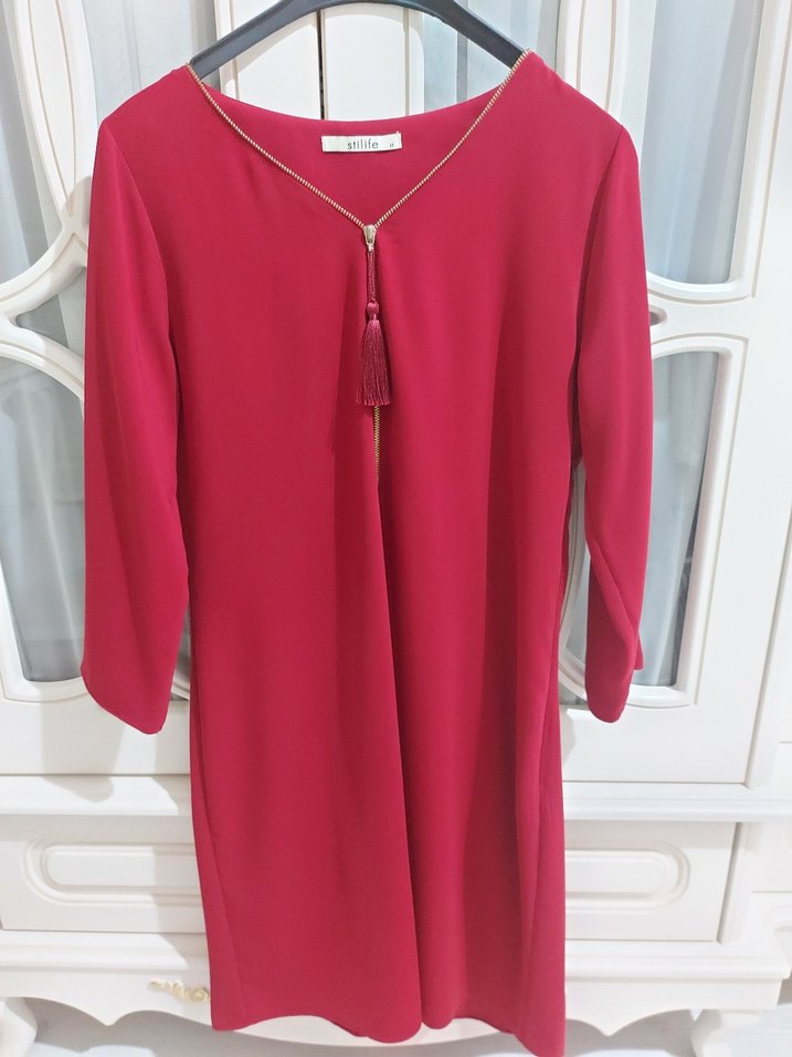 Bordo renginde, V yaka ve püskül detaylı elbise. Çok az giyildi. Hiçbir kusuru yoktur.