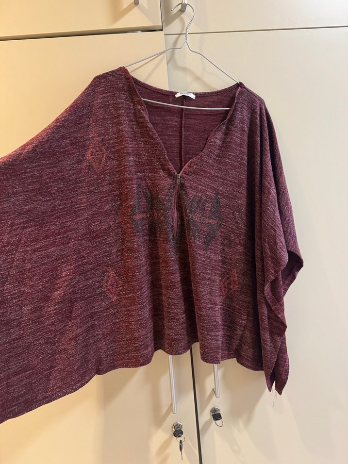 Bordo renkli kadın panço, V yaka , salaş kesimlidir. Yumuşak dokulu kumaştan, bohem tarzda ve batik desenlidir. Günlük kullanım için uygundur. Az kullanılmıştır kusuru yoktur.