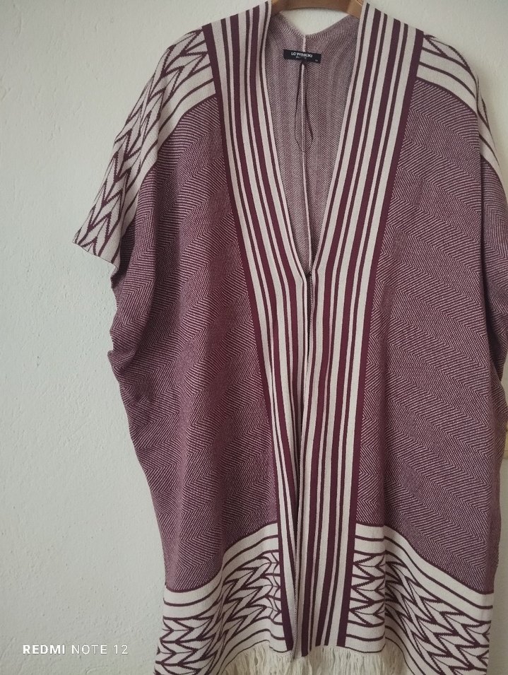 İki kol arası göğüs ölçüsü 75 cm boy ölçüsü 88 cm. Bordo ve gri tonlarda, V yaka ve salaş kesime sahip, kısa kollu uzun kadın panço. Bohem tarzda, drapeli ve kumaş dokulu şık tasarım.