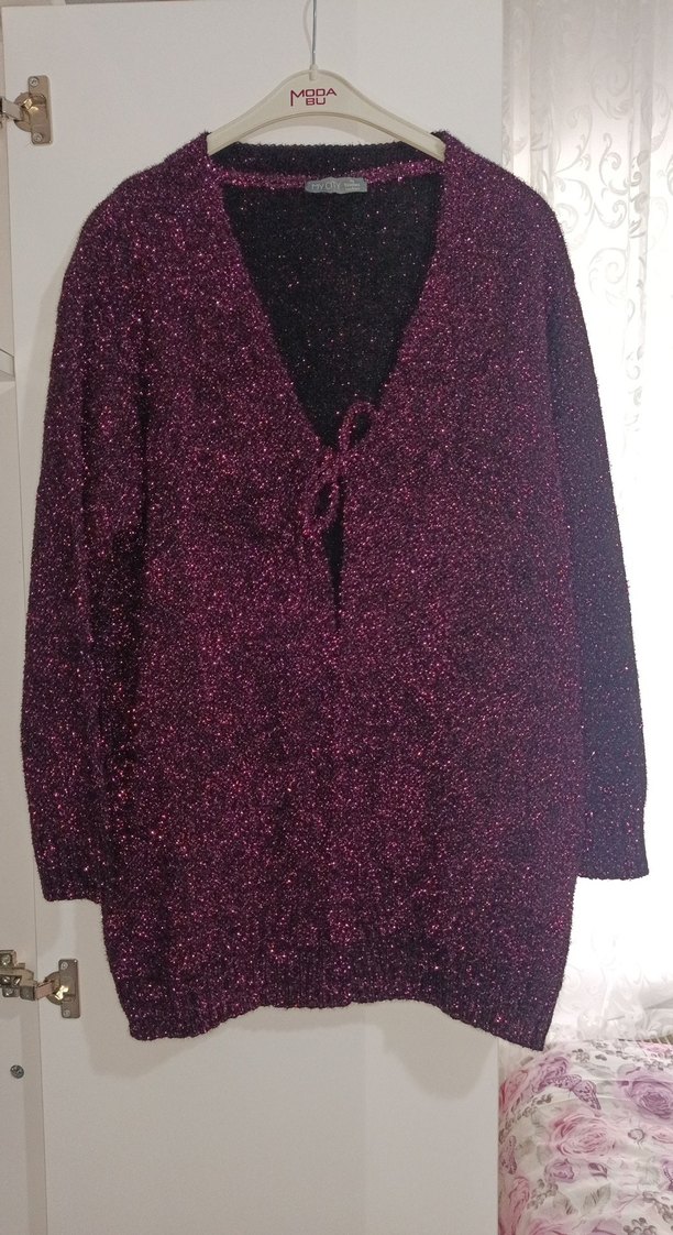 Bordo renkli, V yaka ve uzun kollu örgü kadın hırka. Rahat kesimi ve midi boyu ile parti ve günlük kullanım için uygundur.