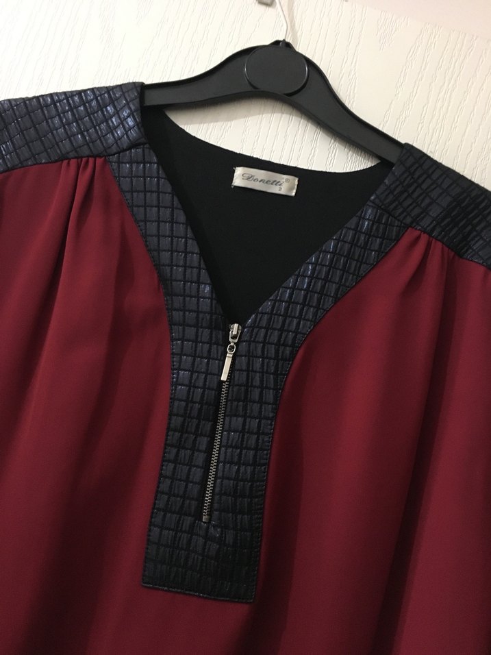 Bordo sentetik kumaştan, fermuarlı V yakalı ve uzun kollu bol kesim bluz. Siyah dokulu detaylarla modern ve şık bir görünüm sunar.
