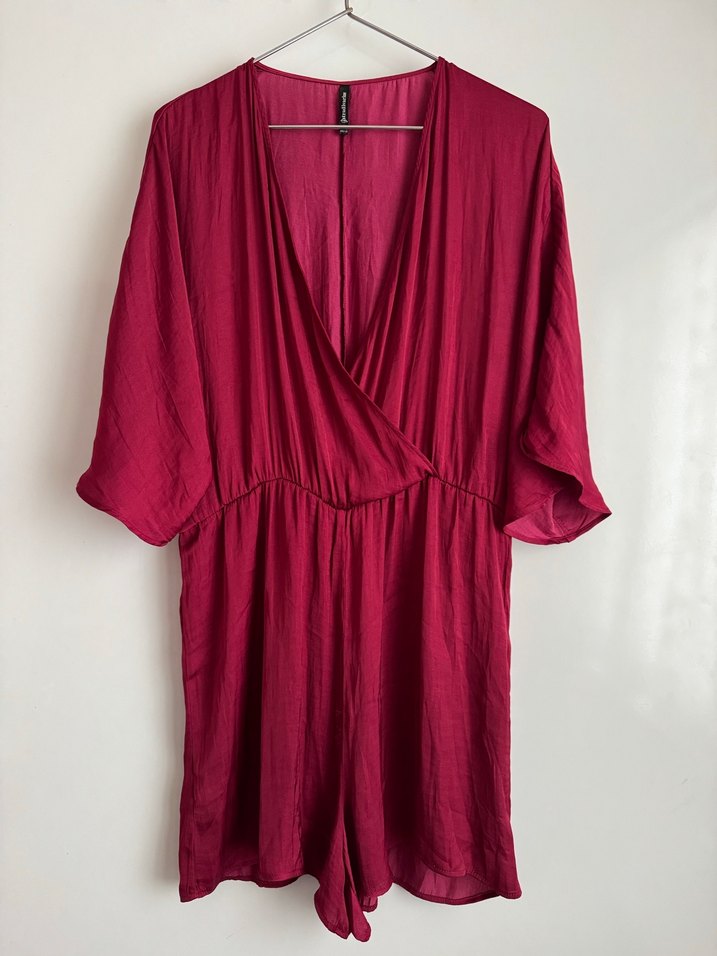 Bordo V Yaka Kısa Tulum Elbise