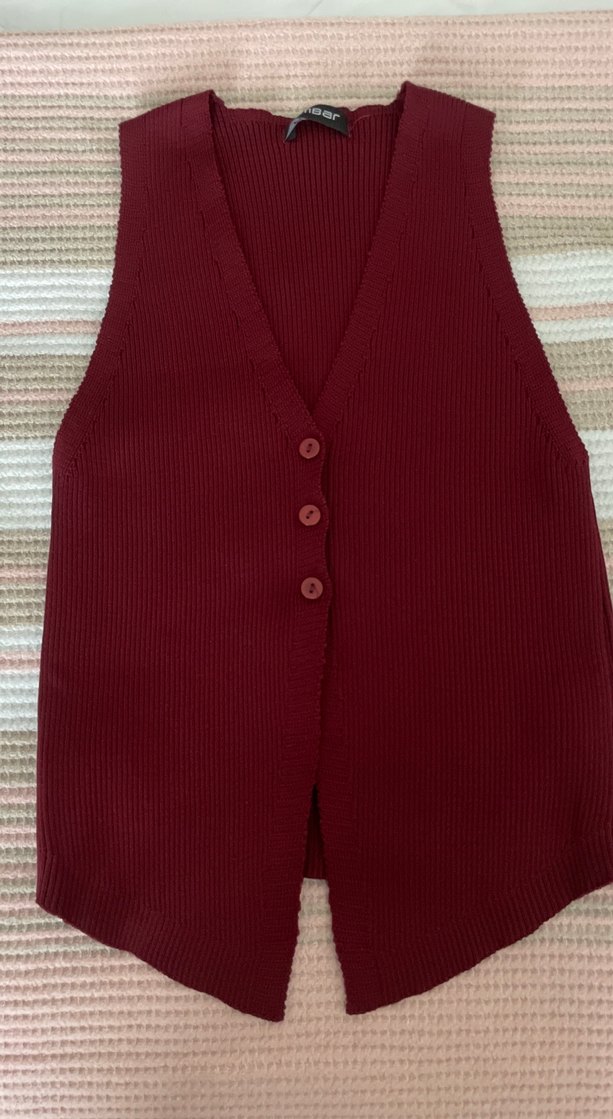 Bordo, V yakalı, düğmeli, triko kadın yelek. Kolsuz ve vücuda oturan kesimiyle günlük sokak stiline uygundur. Rahat ve desensiz yapıda.