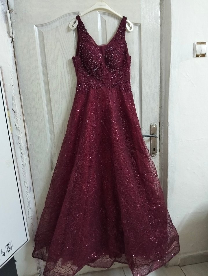 Bordo renkli uzun abiye elbise, V yaka ve kolsuz kesime sahiptir. Drapeli ve desen içermeyen kumaşıyla modern klasik tarz sunar, düğünler için uygundur. ✨