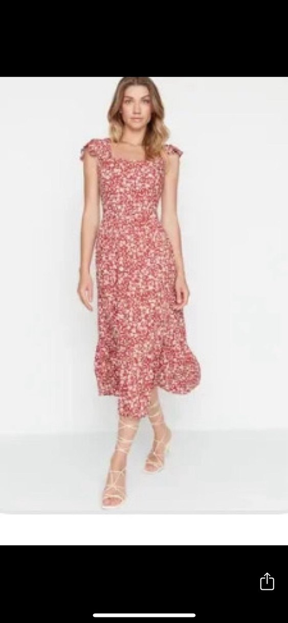 Bordo renkte, ince askılı, V yakalı, fırfırlı ve batik desenli uzun bohem elbise. Hafif sentetik kumaştan, romantik buluşmalar için uygun.