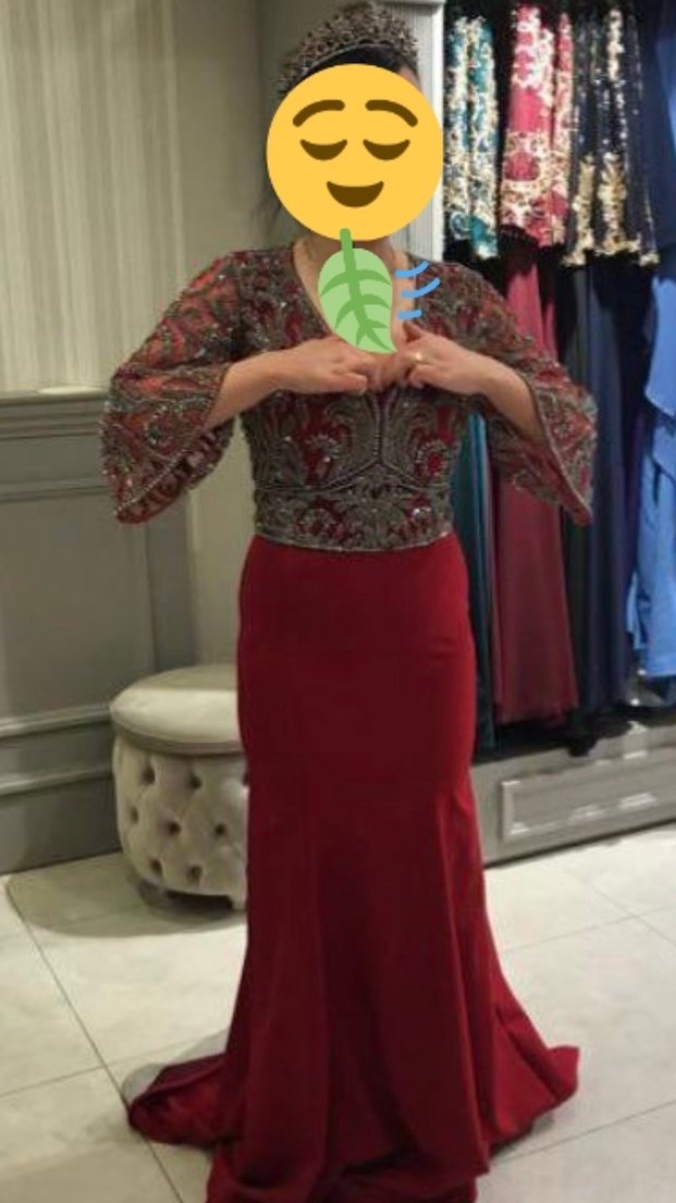 Bordo renkli, uzun ve vücuda oturan bu henna elbise; drapeli, desenli üst kısmı ve uzun kolları ile bohem tarzını yansıtır. V yakalı ve düğünlere uygundur. Kınamda bir kere giydim