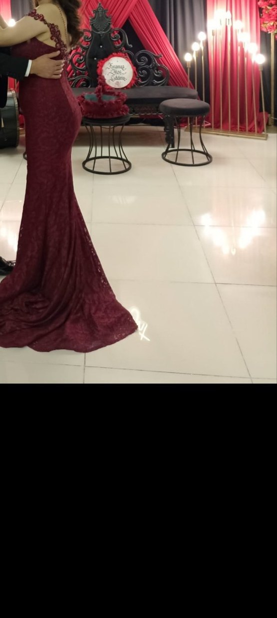 Bordo renkli, parlak desenli kumaştan yapılmış, uzun ve drapeli, V yakalı ve askılı kollu, klasik ve modern çizgide şık abiye elbise isteyen kişiye ayrıntılı görsel de atabilirim