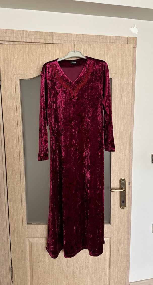 Bordo renkli, V yakalı ve uzun kollu bu uzun elbise, yumuşak sentetik kumaştan üretilmiştir. Salaş kesimi, drapeli tasarımı ve batik desenleriyle bohem tarzı yansıtır.