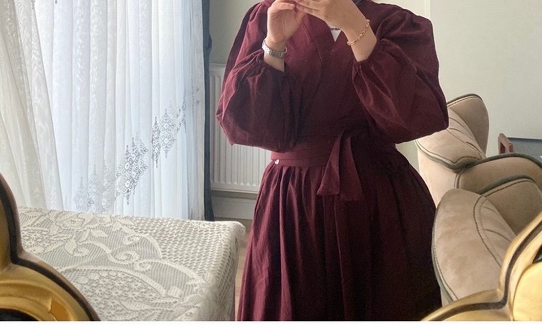 Bordo renkli, keten kumaştan yapılmış, V yaka ve drapeli detaylara sahip uzun, bol kesim elbise. Uzun kollu, bohem tarzda, günlük kullanıma uygun.