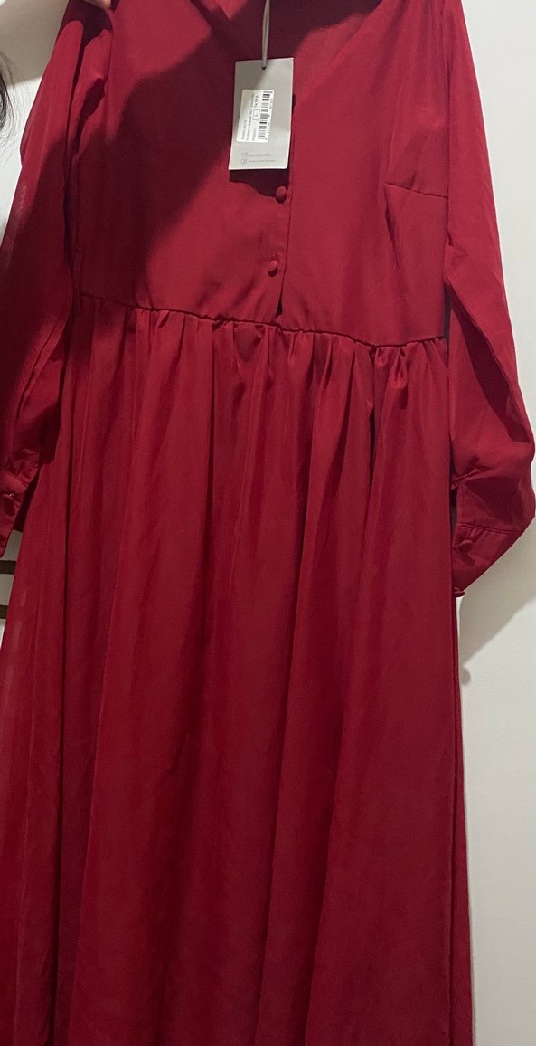 Bordo renkli, uzun kollu ve V yakalı, düğmeli, bol kesim uzun elbise. İpeksi kumaştan, minimalist ve bohem tarzda, klasik şıklık için uygun.