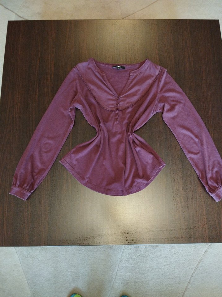 Bordo renkte, düğmeli V yakalı, uzun kollu, normal midi boyda ve bol kesim pamuklu kumaştan yapılmış günlük kullanıma uygun bluz.