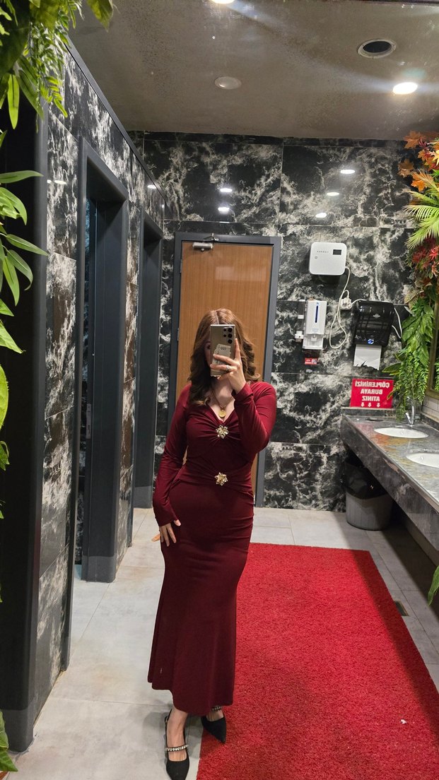 Bordo, uzun kollu ve V yakalı, drapeli tasarıma sahip ince kesim elbise. Parlak, ipeksi kumaştan yapılmış, cesur ve gösterişli stil için uygundur. Sadece bir kere giyildi.Temiz bir şekilde kargolanacaktır.