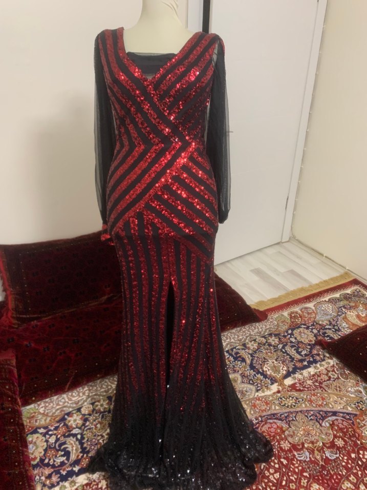 Bordo renkli, V yakalı ve uzun kollu bu uzun abiye elbise, cesur desenli ve drapeli tasarımıyla dikkat çeker. Düzenli kesimlidir ve partiler için uygundur. ✨