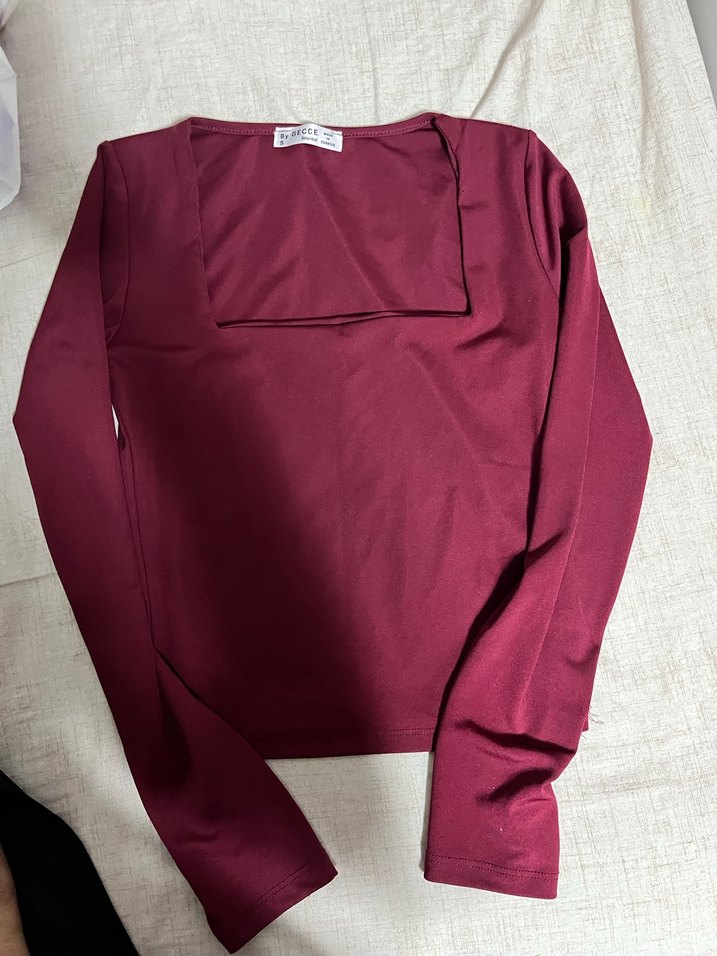 Bordo renkte, V yaka ve uzun kollu, düz ve sade tasarıma sahip, günlük kullanıma uygun, vücuda oturan kadın bluz.