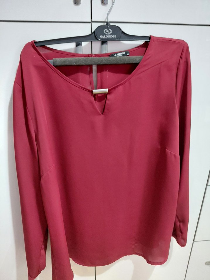 Bordo parlak renkte, V yakalı ve uzun kollu kadın bluz. Rahat kesim ve normal boyda, ipeksi kumaştan, minimalist ve şık, ofis için uygun. ✨