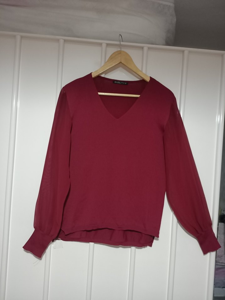 Bordo renkte, V yaka ve uzun kollu, ipeksi kumaştan yapılmış, bol kesim kadın bluz. Minimalist tasarımıyla günlük kullanıma uygun, zahmetsiz şıklık sunar. kolları tül detaylı