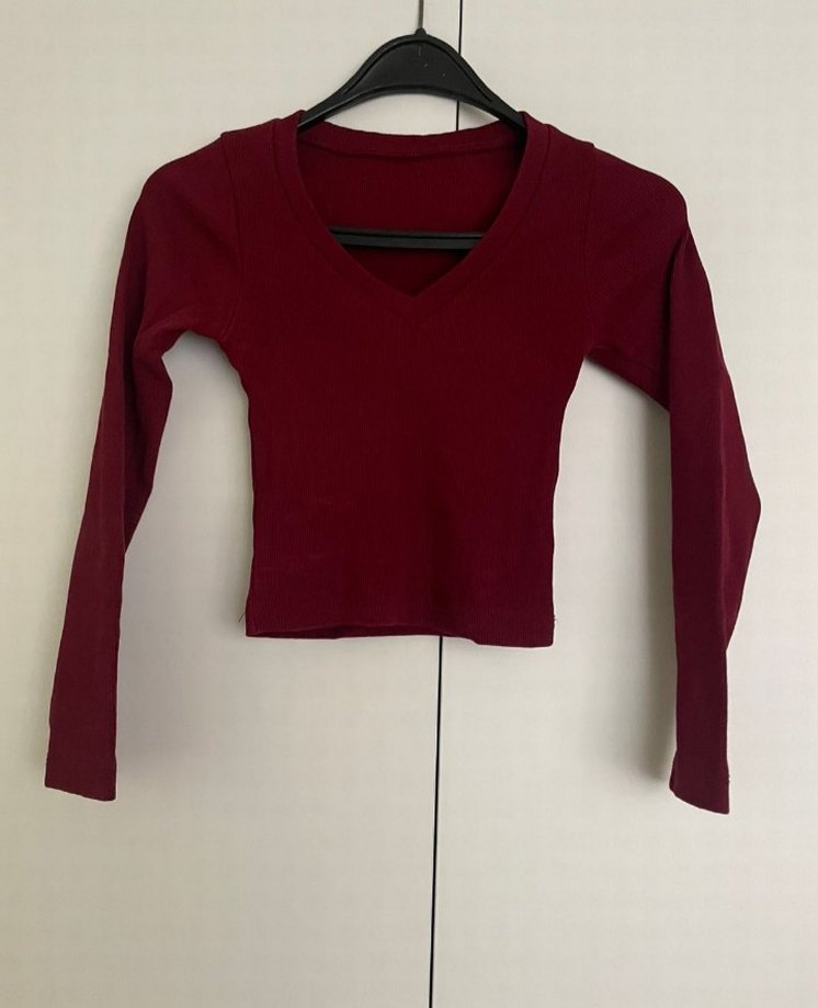Bordo renginde, V yaka ve uzun kollu, vücuda oturan kadın kazak. Düz ve şık tasarımı, günlük sokak stiline uygundur. Rahat sentetik kumaştan üretilmiştir.