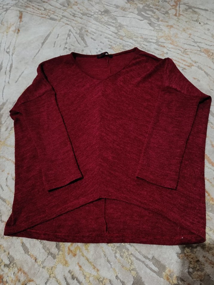 Bordo renkli, V yaka ve uzun kollu kadın triko. Yumuşak keten kumaştan, örme dokulu ve sade desensiz, günlük kullanım için uygun.