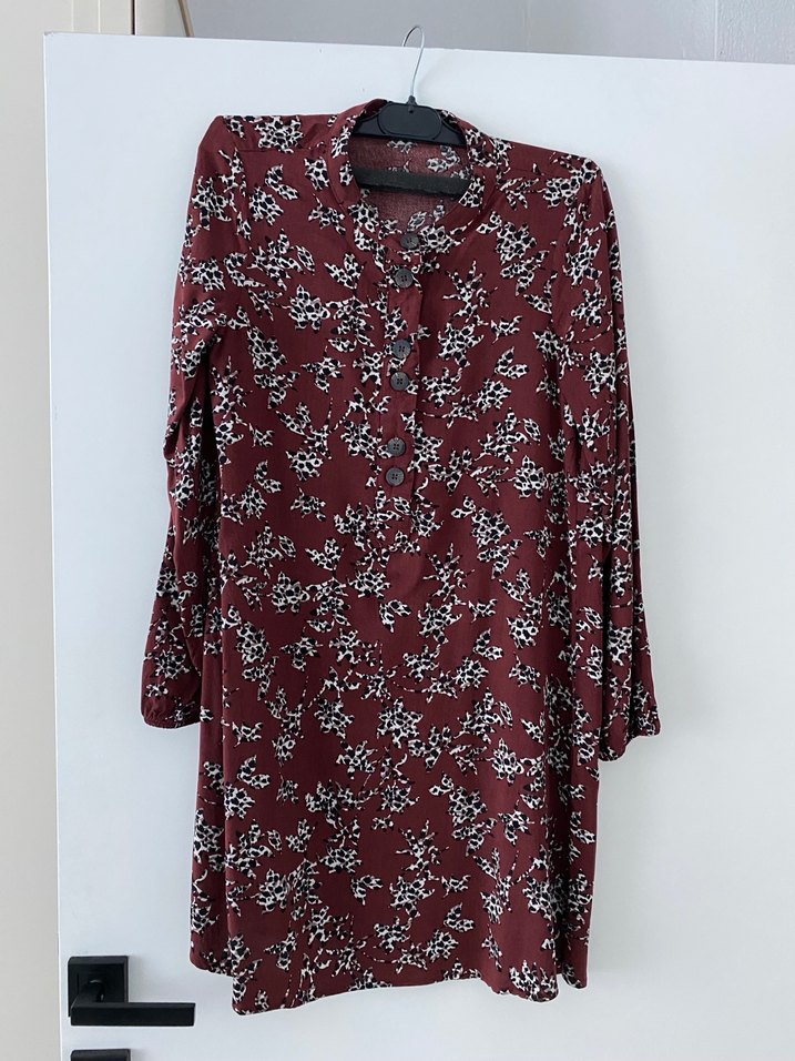 Bordo renkli, V yaka ve uzun kollu, düğmeli ön kısmı olan, midi boyda, hafif dökümlü sentetik kumaştan yapılmış bağlama desenli tunik. Günlük kullanım için uygundur.