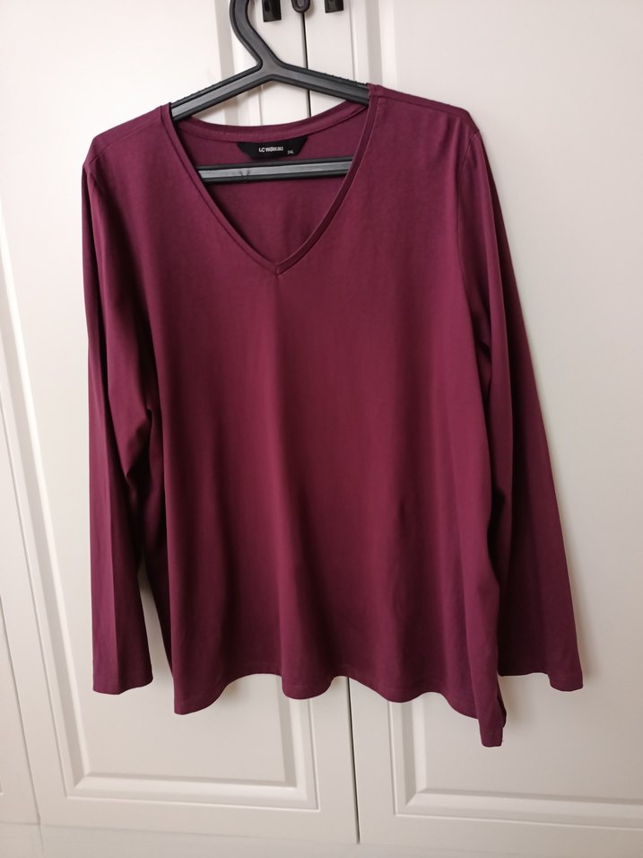 Bordo renginde, V yakalı ve uzun kollu, salaş kesim 2xl beden penye kadın tisort. etek ucu iki yandan yırtmaçlıdır. gündelik kullanıma uygun, sade ve rahat bir modeldir. hiç kullanılmadı bir defa bedeni görmek için yıkandı. beden olmadığı için satışta. boy olarak tam da seni örtmüyor biraz kısa. ürünün güncel satış fiyatı fotoğraflarda gösterilmiştir.
