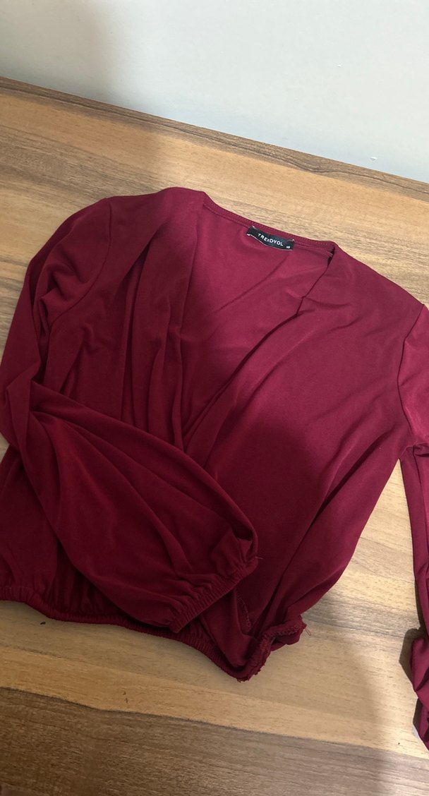Bordo renkli, V yaka ve uzun kollu, ipeksi kumaştan yapılmış, salaş ve drapeli rahat bir bluz.