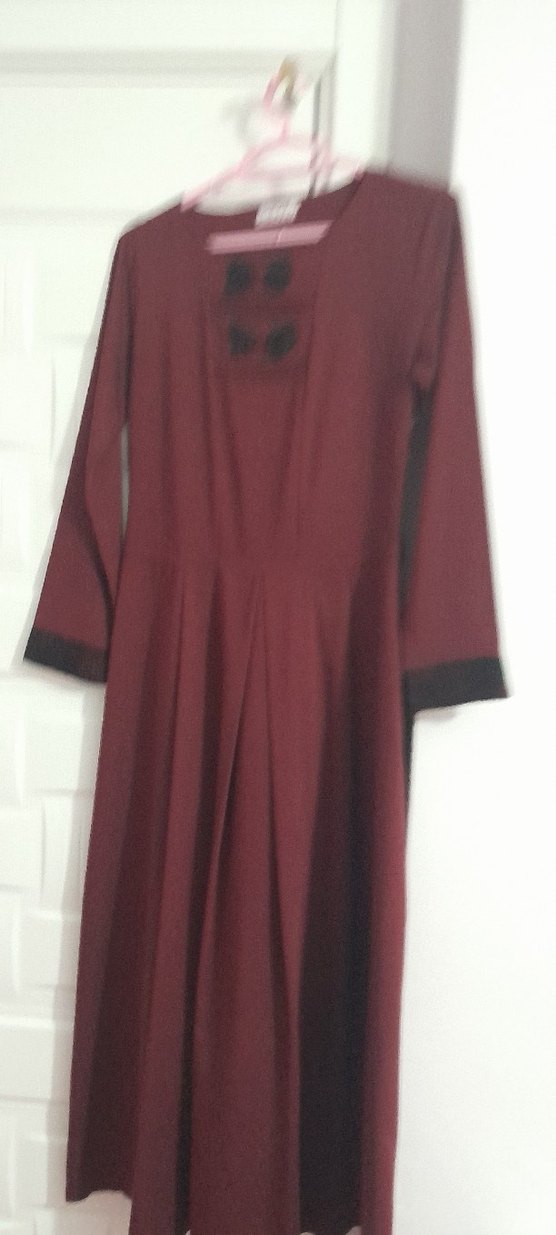 Bordo renkte, V yakalı, uzun kollu ve salaş kesimli bu uzun elbise, satenimsi kumaştan yapılmıştır. Vintage goth tarzını klasik şıklıkla yansıtır, kolları dantel detaylı arkası bağlamalı
