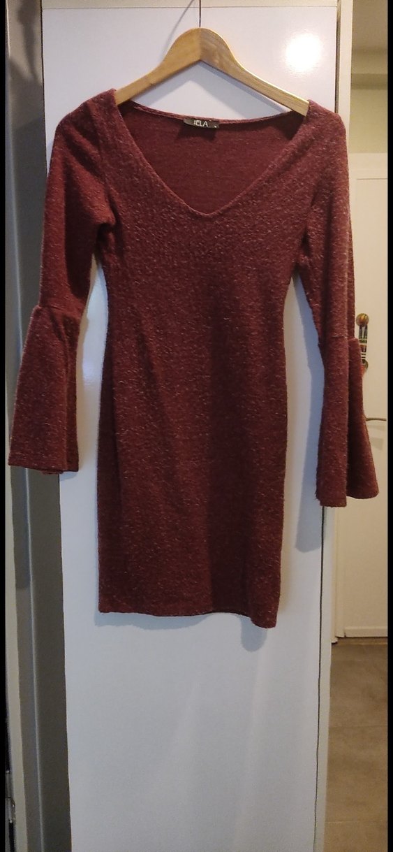 Bordo renkte, v yaka ve uzun, genişleyen kollara sahip, triko kumaştan yapılmış, vücuda oturan mini elbise. Romantik akşamlar için ve günlük giyime uygundur. ❤️