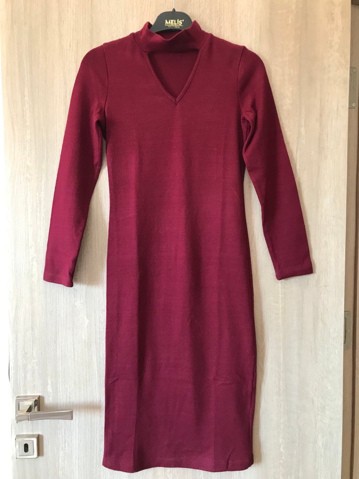Bordo renkli, v yaka ve uzun kollu, vücuda oturan triko elbise. Yumuşak sentetik kumaştır. Minimalist ve sade tarzda, günlük kullanıma uygun.