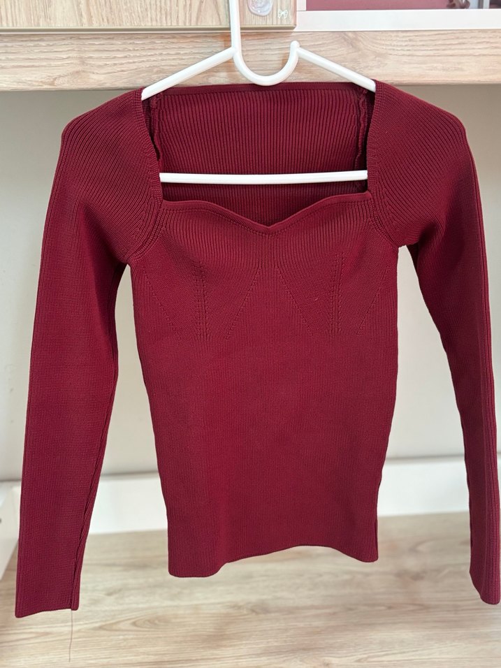 Bordo renkli, V yaka ve uzun kollu bu triko kazak, yumuşak örme kumaş