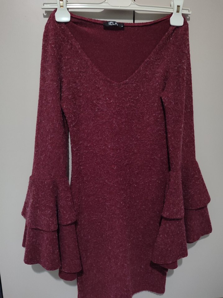 Bordo renkli, V yaka ve uzun katlı kolları olan, yumuşak yünden örülmüş, parlak görünümlü, midi boy ve vücuda oturan triko elbise. indirim payı vardır