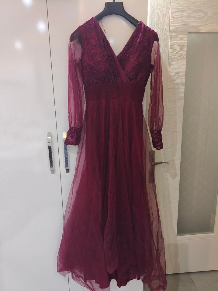 Bordo V Yaka Uzun Kollu Vintage Abiye Elbise