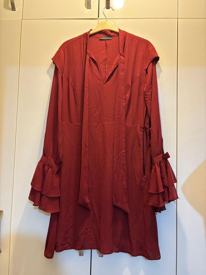 Bordo renkli, V yaka, uzun kollu kadın elbise Bol kesim ve volan detaylı kollarıyla, ipeksi dokusu ve midi boyuyla romantik akşamlar için ideal, bohem Paris tarzında.
