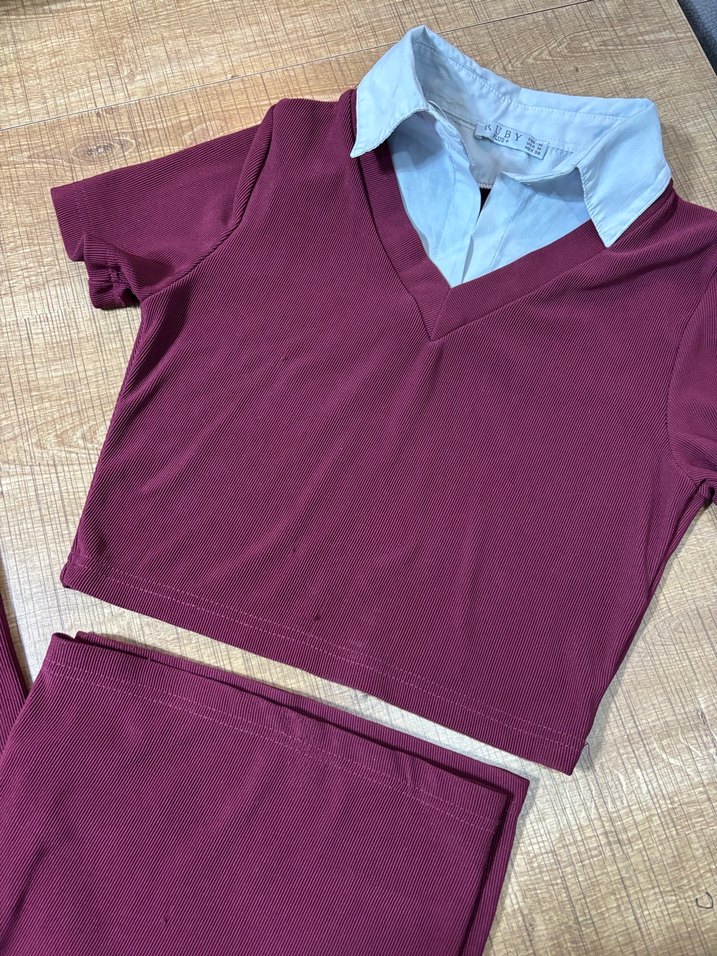 Bordo renkte, V yakalı ve kısa kollu tişörtü. Beyaz yakalı katmanlı görünümüyle günlük sokak modasına uygun rahat bir tasarım sunar. Takım dır pantolon uzun İspanyol paça ve yüksek beldir