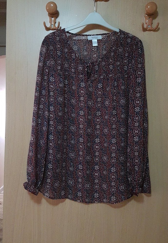 Bordo renkli, uzun kollu, V yakalı ve düğmeli bohem tarzda kadın bluz. Gevşek kesim ve koyu renkli tie-dye desenlidir, yumuşak sentetik kumaştan yapılmıştır.