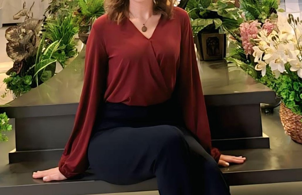 Bordo renkte, ipeksi dokulu, drapeli ve V yakalı kadın bluz. Uzun kollu, midi boyda ve ofis ortamına uygun modern tasarım.