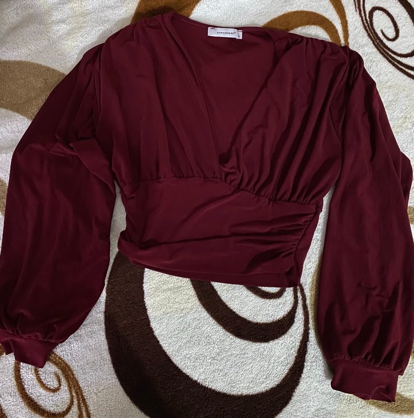 Bordo parlak renkte, V yaka ve uzun kollu, drapeli tasarıma sahip dar kesim kadın bluz. Günlük sokak stili için uygun.