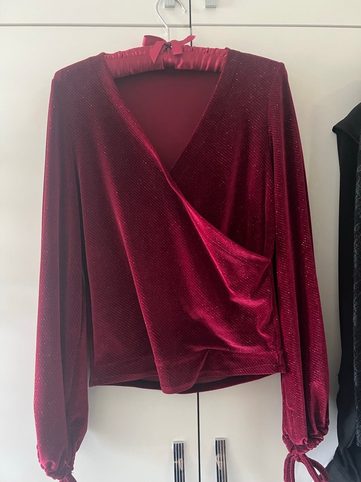 Bordo renkte, V yakalı ve kolları bağcıklı uzun kollu, drapeli tasarıma sahip fitted kadın bluz. Yumuşak sentetik kumaştan, midi boyda, romantik akşamlar için uygun.