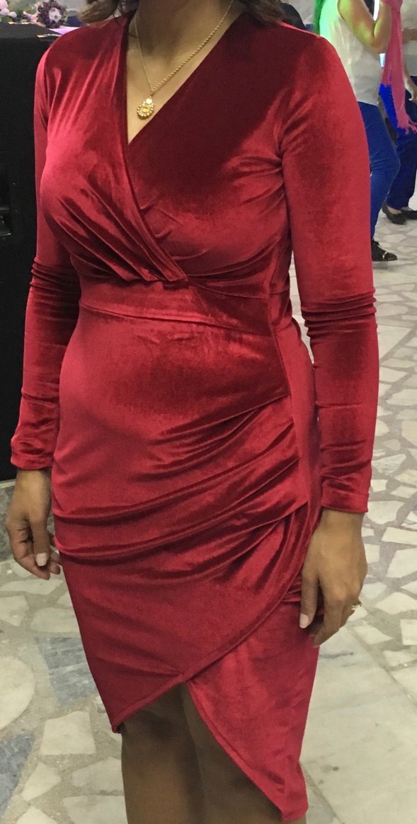 Bordo parlak kumaştan, V yakalı ve uzun kollu, drapeli tasarımlı, vücuda oturan midi abiye elbise. Romantik akşamlar için uygun.
