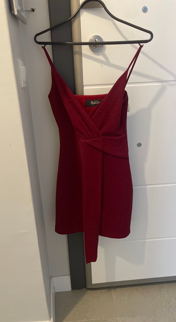 Bordo renkli, V yakalı ve kolsuz, drapeli detaylı, vücuda oturan mini abiye elbisedir. Romantik akşamlar için cesur ve modern bir tercihtir.