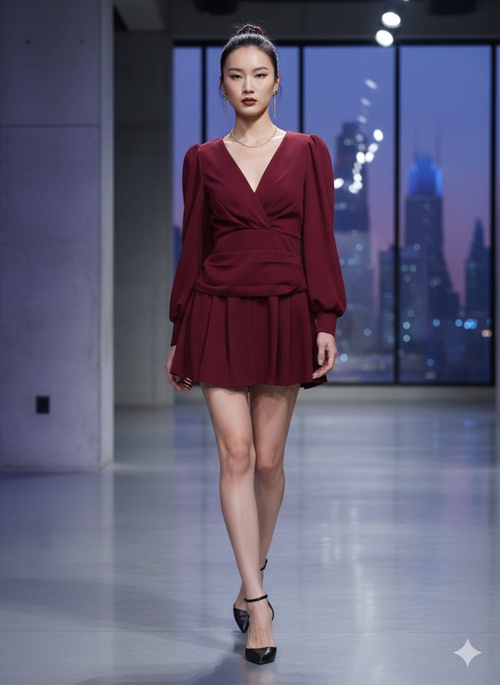 Bordo renkli, V yakalı ve uzun kollu mini elbise. İpek gibi kumaştan, drapeli tasarıma sahip, romantik akşamlar için uygun. ✨