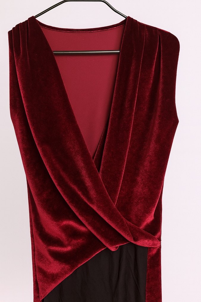 Bordo renkli, drapeli V yakalı ve uzun kollu, uzun kesimle romantik akşamlar için uygun, fit kesim gotik ve avangart tarzda çıt çıtlı body.