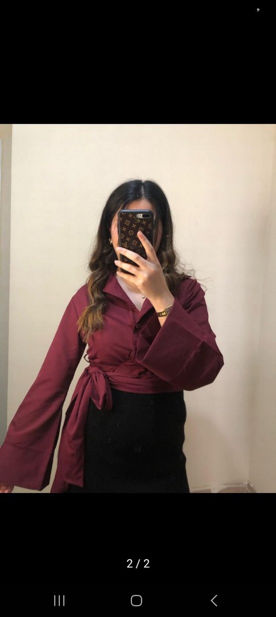 Bordo renkli, V yakalı ve uzun kollu midi boy bluz. Düğmeli ve belden bağlamalı tasarımıyla rahat ve şık bir görünüm sunar.